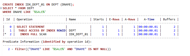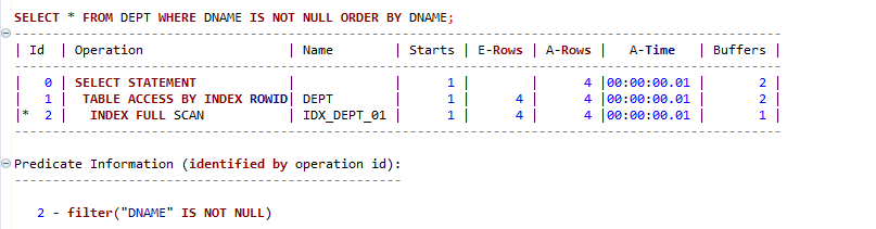 왜? 인덱스 활용을 못하고 TABLE FULL 스캔한 이유는 컬럼에 NOT NULL이 아니면 오라클은 컬럼에 NULL이 있다고 판단