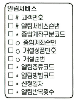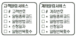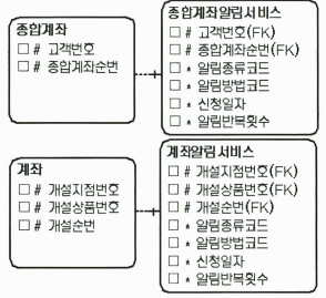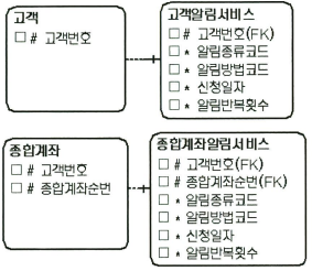 알림서비스를 관리하는 엔터티로, 고객별로 관리하는지 계좌별로 관리하는지에 따라 주식별자가 달라진 엔터티. 단 주식별자를 구성한 속성의 개수는 같음.