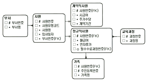 서브타입인 정규직사원 ·계약직사원 엔터티의 주식별자는 슈퍼타입인 사원 엔터티의 주식별자인 사원번호를 상속