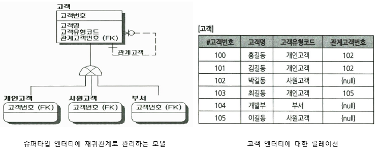 위 모델은 사원이 개인고객을 관리한다는 요건으로 인해 슈퍼타입에 재귀관계가 생겼다.