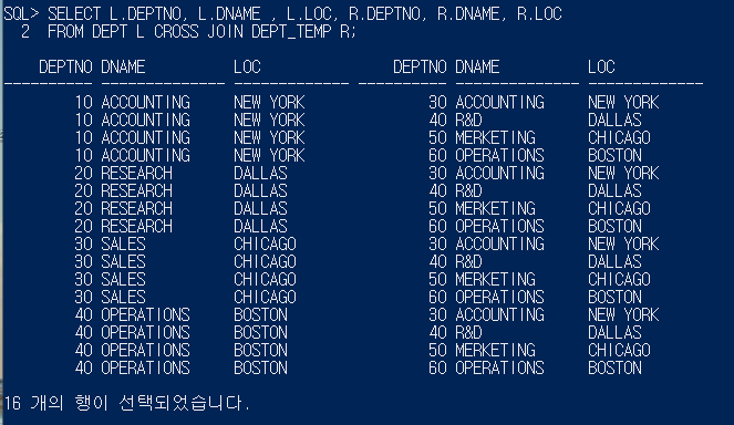 - CROSS JOIN : JOIN 가능한 모든 경우의 수를 출력하지만 OUTER JOIN 은 제외(양쪽 테이블 *곱한결과)