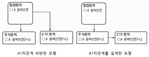 통합종목 엔터티는 모든 종목을 통합관리하는 엔터티이다. ETF종목에도 포함되지만, 주식에 직접 포함되는 종목이다. 이런업무규칙를 정확히 반영한 것이 #1차관계를 설계한 모델 이다. 통합종목엔터티와 ETF종목 엔터티는 직접적인 관계가 없으며 간접관계가 존재한다. #1차관계를 위반한 모델은 통합종목 엔터티와 ETF종목 엔터티는 관계가 아예엾는건 아니지만 1차관계는 아니며 직접관계인 주식종목엔터티와 ETF종목엔터티의 관계가 생략됐으므로 잘못된 모델이다.