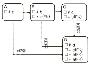 ad관계와 bd관계는 추출관계다. D엔터티의 a속성, b속성은 추출속성이다. D엔터티입장에서 바로 위의 상위엔터티가 C엔터티이므로 'cd관계'가 중요하다. 'cd관계'만 알면 업무를 수행하는데 문제가 없다. ad관계와 bd관계는 1차관계가 아니다. D엔터티와 같이 모든 상위 엔터티와의 관계를 표현하면 모델의 가독성을 떨어트리게 된다.